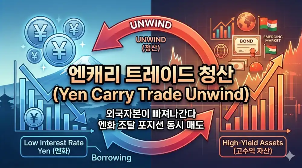 “엔캐리”라는 표현은 시장에서 축약해서 부르는 말처럼 쓰이기도 하는데, 핵심은 ‘엔화 조달 기반의 캐리 포지션이 접히는 것’이다.